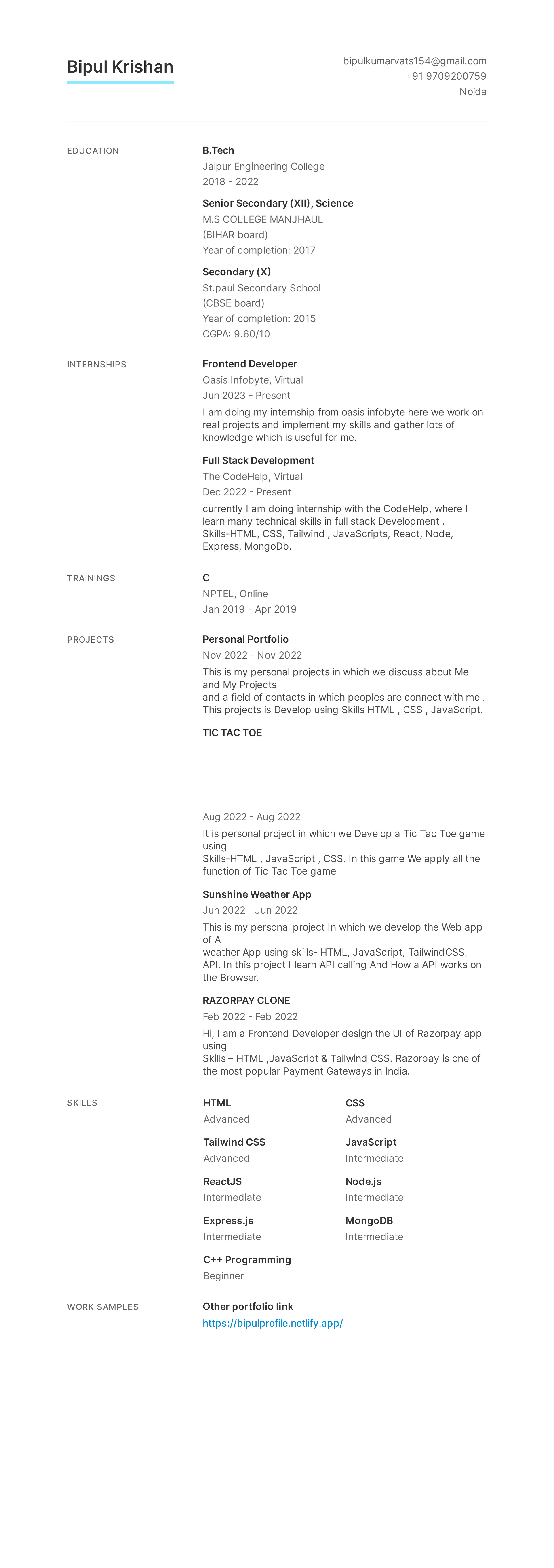 Hi Everyone My name is Bipul Krishan I am a Full Stack Web Developer Currently I am doing an internship from The CodeHelp in Full Stack Development. Where I gather lots of Knowledge and Work on many real Life projects.Currently I am working on Node.js and Making a server.